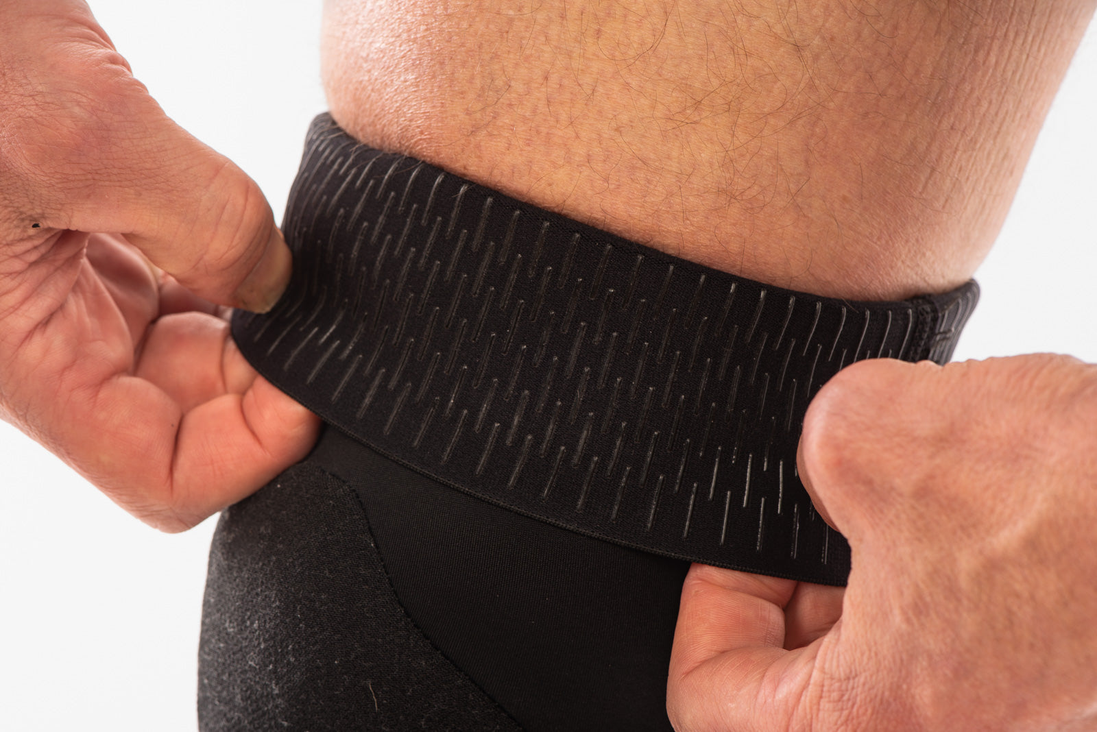 The performance sleeve uses durable, stretch fabric for a close, breathable fit, supported by a contoured internal bracing layer that helps keep the pad in position. Up top, a wide silicone-impregnated cuff with segmented vertical grip lines replaces traditional solid silicone bands. By spreading traction over a larger area, it holds securely without constricting, improves moisture movement, and allows the pad to stretch naturally with the leg.